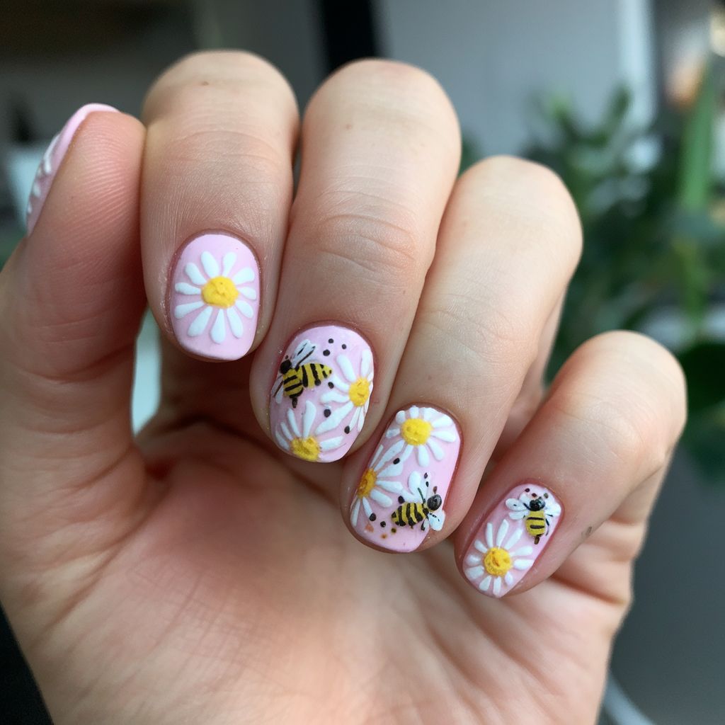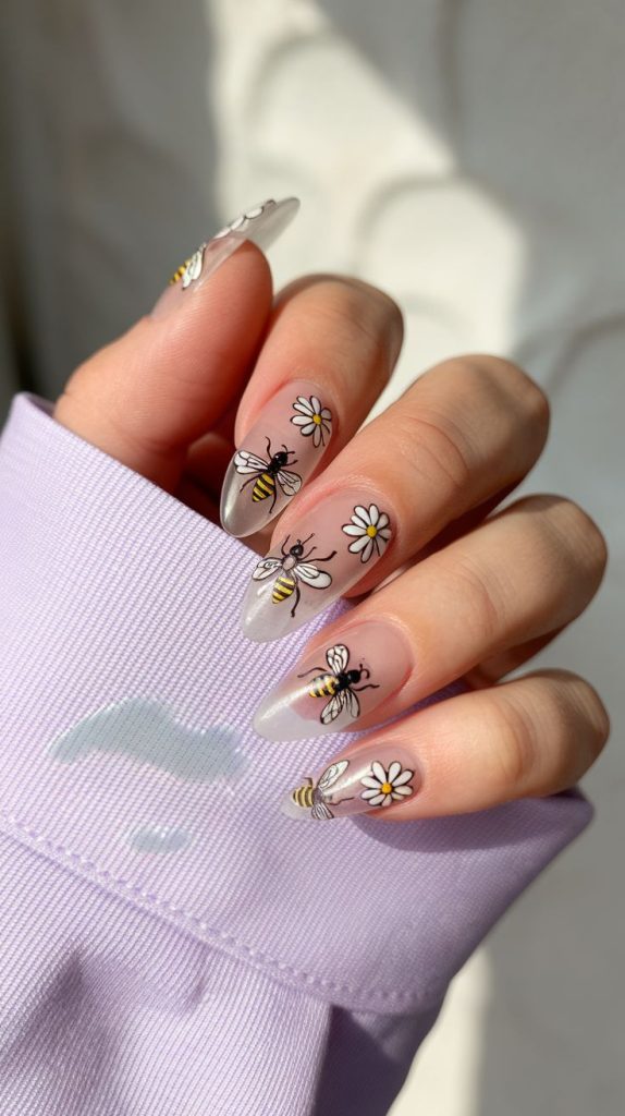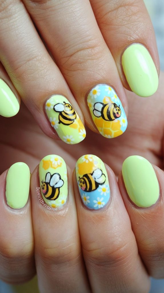 Nail art featuring pastel bees works well for different occasions. Whether it’s a casual day out or a spring gathering, this style suits many looks. The gentle colors keep it playful and stylish without being too bold.